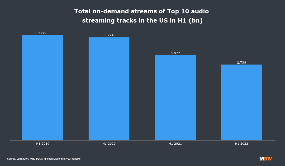 In the first half of 2022, industry players were seeing double-digit percentage increases in revenues with less hits. Spotify's top 10 tracks in the US continued to decline in popularity by volume (decline just shy of 30%).